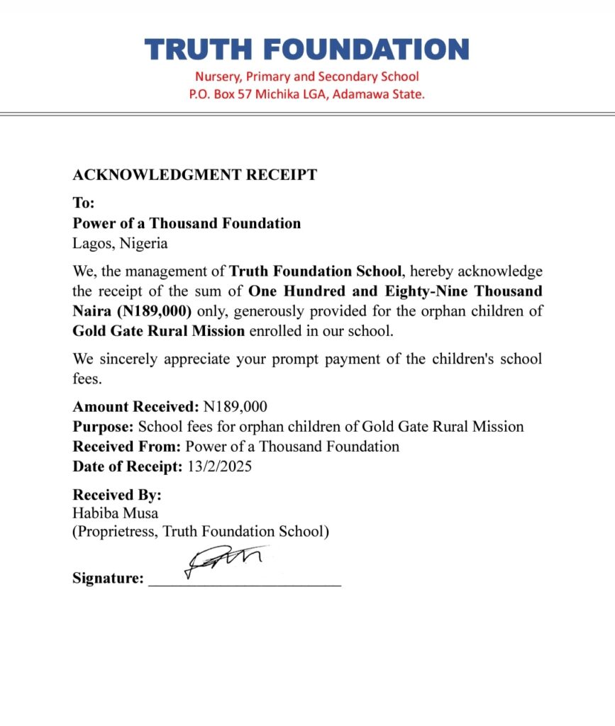 February 2025: Provision of academic scholarships to 27 orphans at Truth Foundation, michika, Adamawa state Nigeria. Leave a Comment / 2025, Impact / Deborah February 2025: Provision of academic scholarships to 27 orphans at Truth Foundation, michika, Adamawa state Nigeria. Read More »