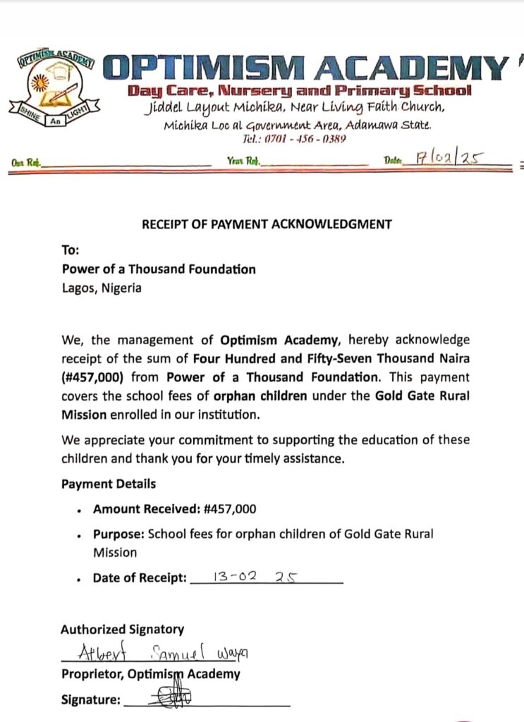 February 2025: Provision of academic scholarships to 28 orphans at Optimism Academy, michika, Adamawa State Nigeria. Leave a Comment / 2025, Impact / Deborah February 2025: Provision of academic scholarships to 28 orphans at Optimism Academy, michika, Adamawa State Nigeria. Read More »