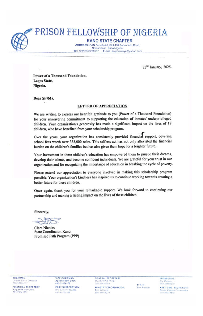 January 2025: Provision of second term academic fees to 19 inmates children of NDLEA, Goron-dutse and Kano central prisons, in Kano state Nigeria. Leave a Comment / 2025, Impact / Deborah January 2025: Provision of second term academic fees to 19 inmates children of NDLEA, Goron-dutse and Kano central prisons, in Kano state Nigeria. Read More »